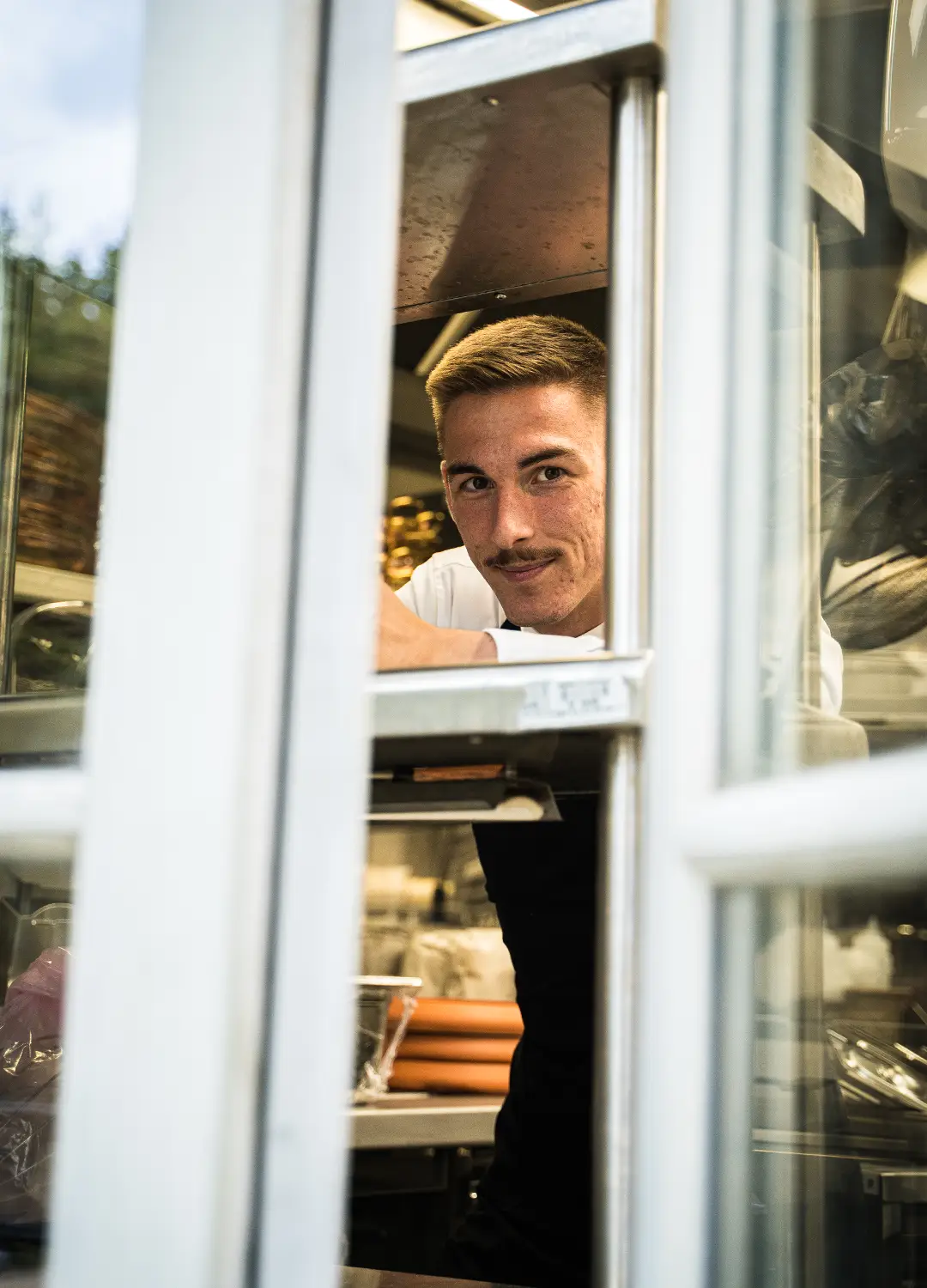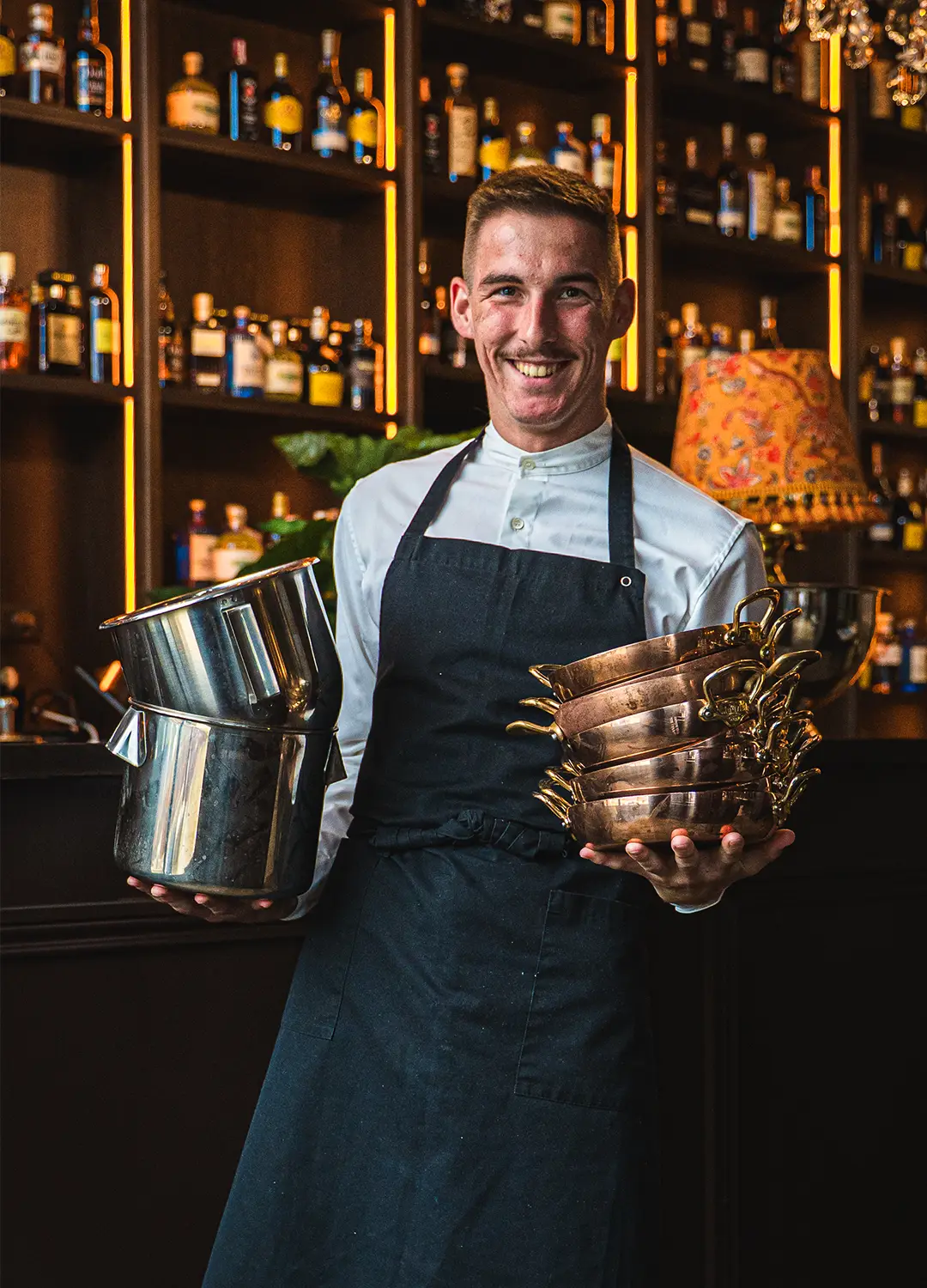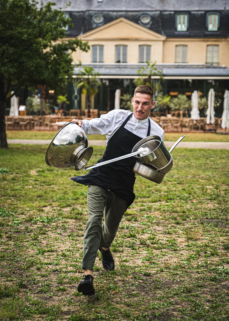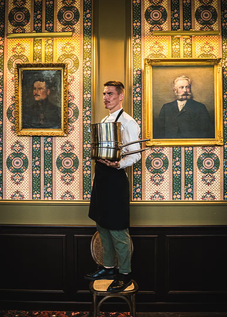 Chou joue l’équilibre entre tradition et modernité. Tapisseries murales, mobilier en velours, clins d’œil à l’iconographie versaillaise : l’esprit du lieu s’y affirme dans les détails et vient contraster avec la cuisine résolument moderne du Chef. Le soir, les regards se tournent vers le piano, qui vient donner du relief à ce décor singulier.
